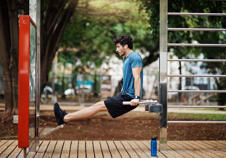 Začněte kliky na bradlech (dipy) – skvělý komplexní cvik, který kromě tricepsu zapojuje i prsa a ramena. Čtyři série po osmi opakováních vás prověří.